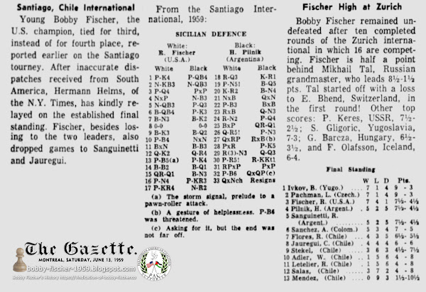Young Bobby Fischer, the U.S. champion, tied for third, instead of for fourth place, reported earlier on the Santiago tourney. After inaccurate dispatches received from South America, Hermann Helms, of the N.Y. Times, has kindly relayed on the established final standing. Fischer, besides losing to the two leaders, also dropped games to Sanguinetti and Jauregui.