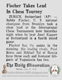 Fischer has 3½ points in the standing. His leading rivals, Paul Keres and Mikhail Tal of Russia have three each and Svetozar Gligoric of Yugoslavia has two.